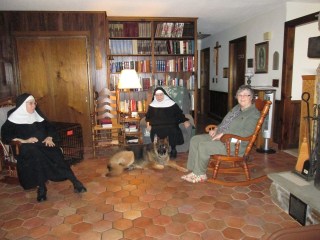 They practice the rule of St. Benedict and live on 36 acres of partially wooded land filled with herds of deer and wild turkeys. They also have a donkey named Placida who brayed for us in song after we petted her. Later, she enjoyed a quartered apple that we fed her. Their house is also filled with dogs of various sizes.