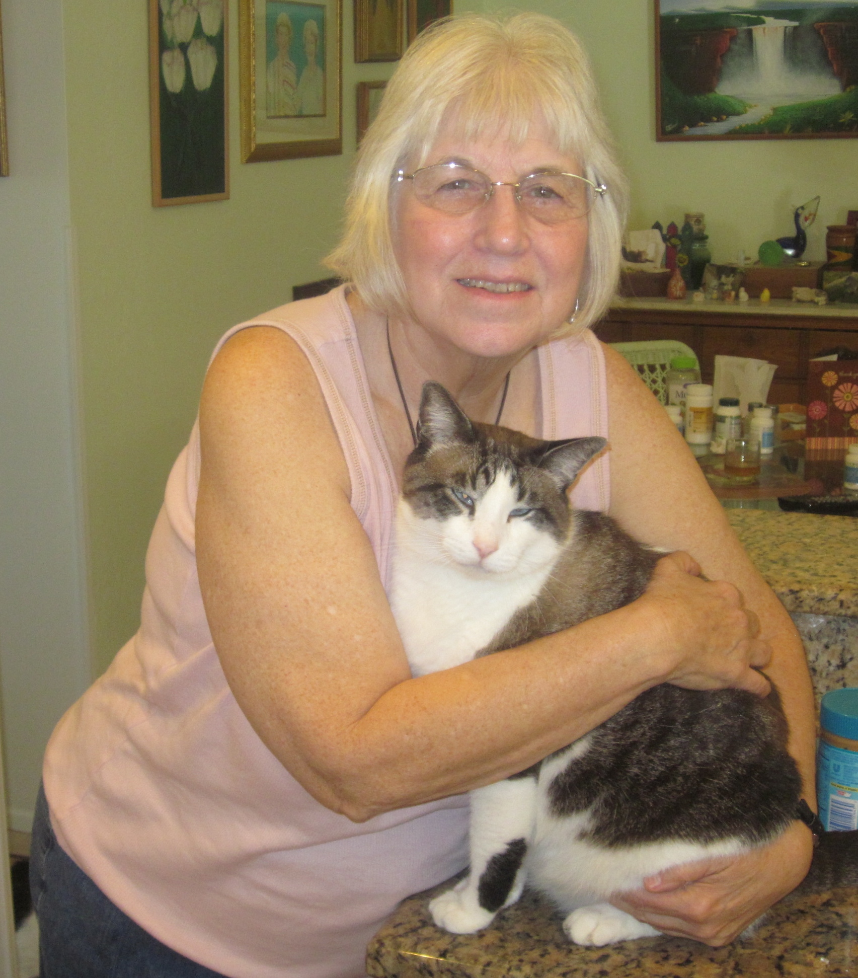 Pastor Judy Lee, ARCWP and Brooklyn Big who joined the other cats and birds at her home from the streets over a year ago.