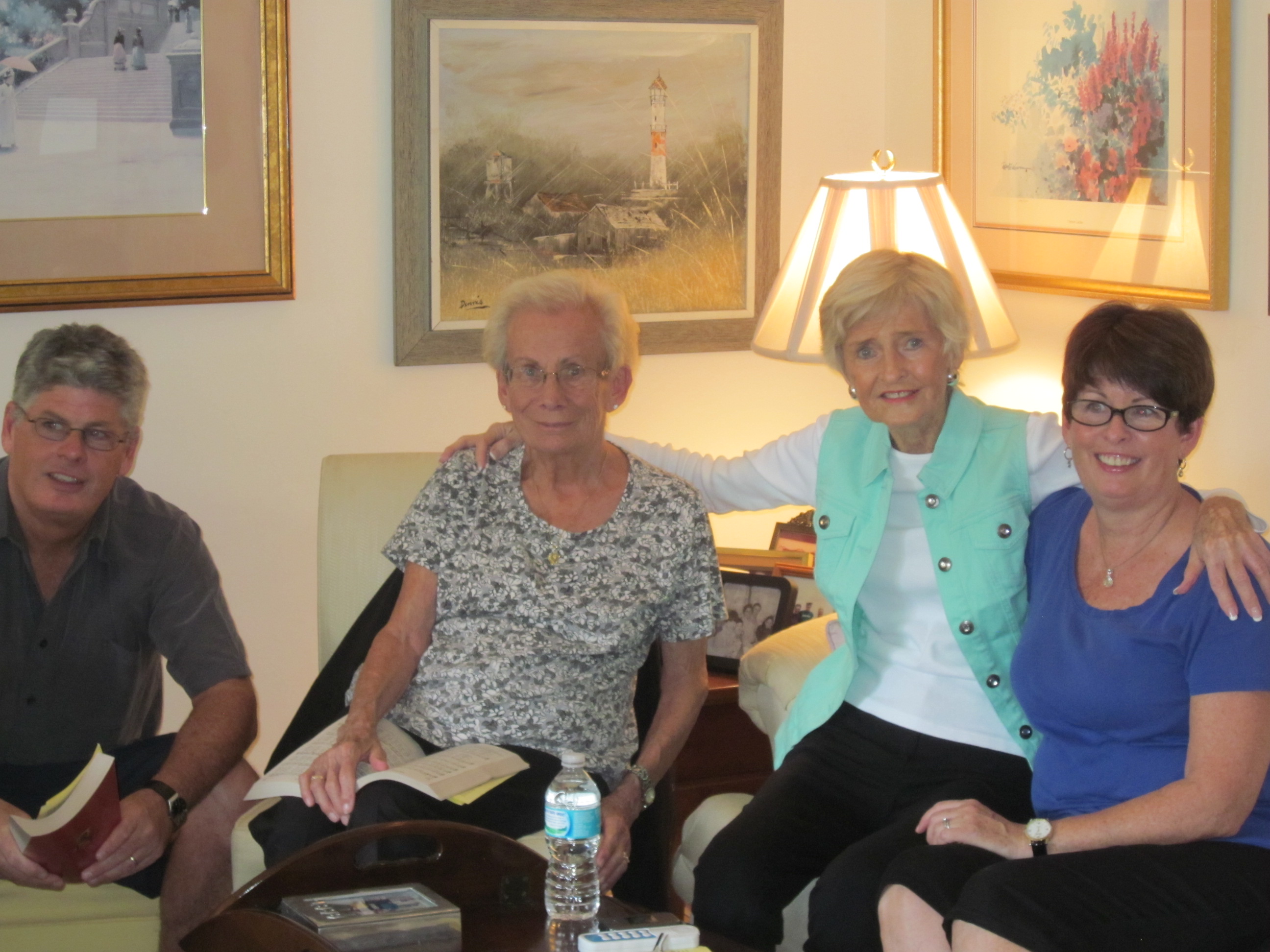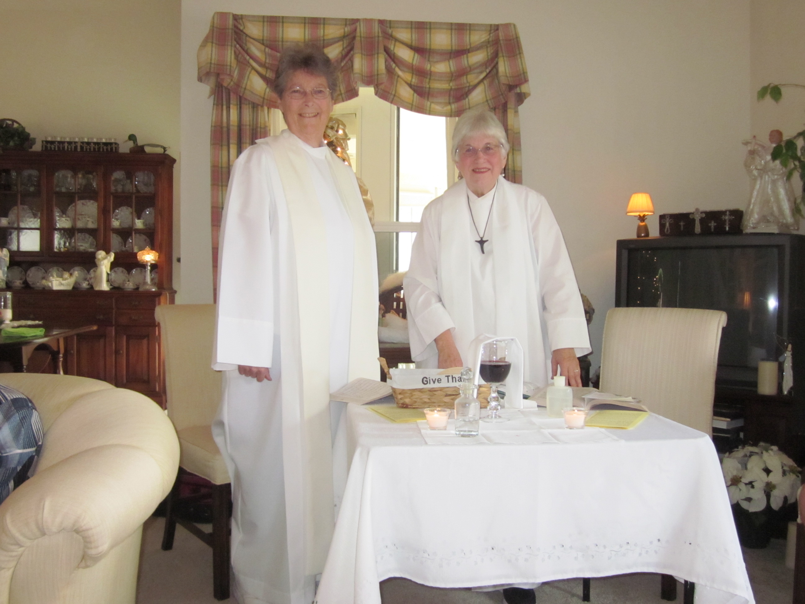 Janet followed Christ in traditional ways and yet with her open mind and heart embraced the women priest movement. She attended my Ordination in Massachussetts with her son Henry and years later she attended Judy Beaumont’s ordination in Florida. A woman of conviction, she accepted and was pleased that there were now women priests within her beloved Roman Catholic Church. Eternally optimistic, she believed that some day women priests would be able to take their rightful place in the church, right beside their brother priests. She believes this to be a possibility with Pope Francis. And so, when we learned that she would dearly love to attend Mass again though she was not able to leave her home we responded. She was delighted and able to participate fully, planning hymns and music. Her neighbor and friend Bert was there to play the violin. What ensued was one of the most spiritual and meaningful Masses we have ever attended or presided in.