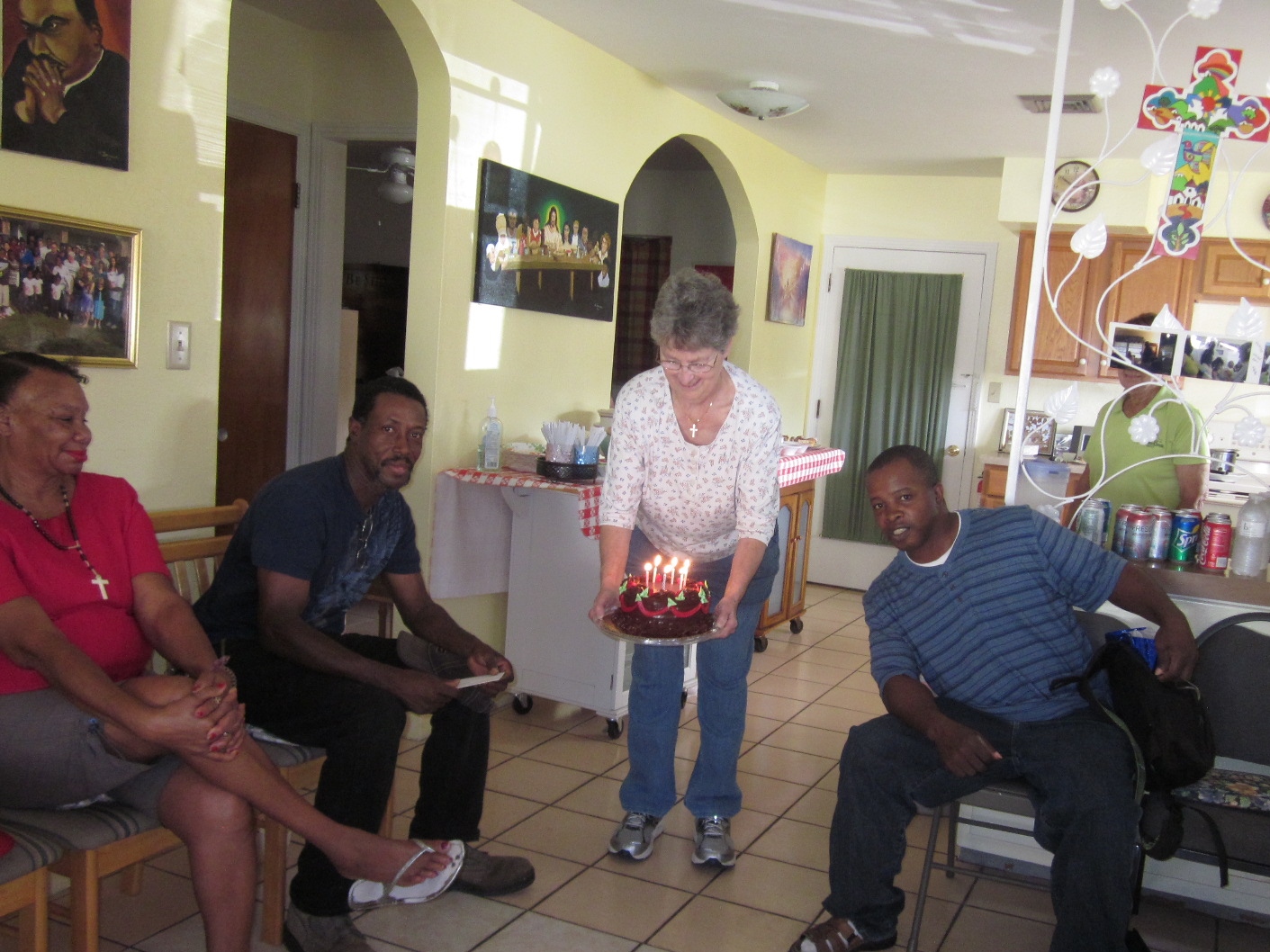 Pastor Judy Beaumont brings Eddie and Robert a Birthday cake as Betty looks on during our Tuesday Church