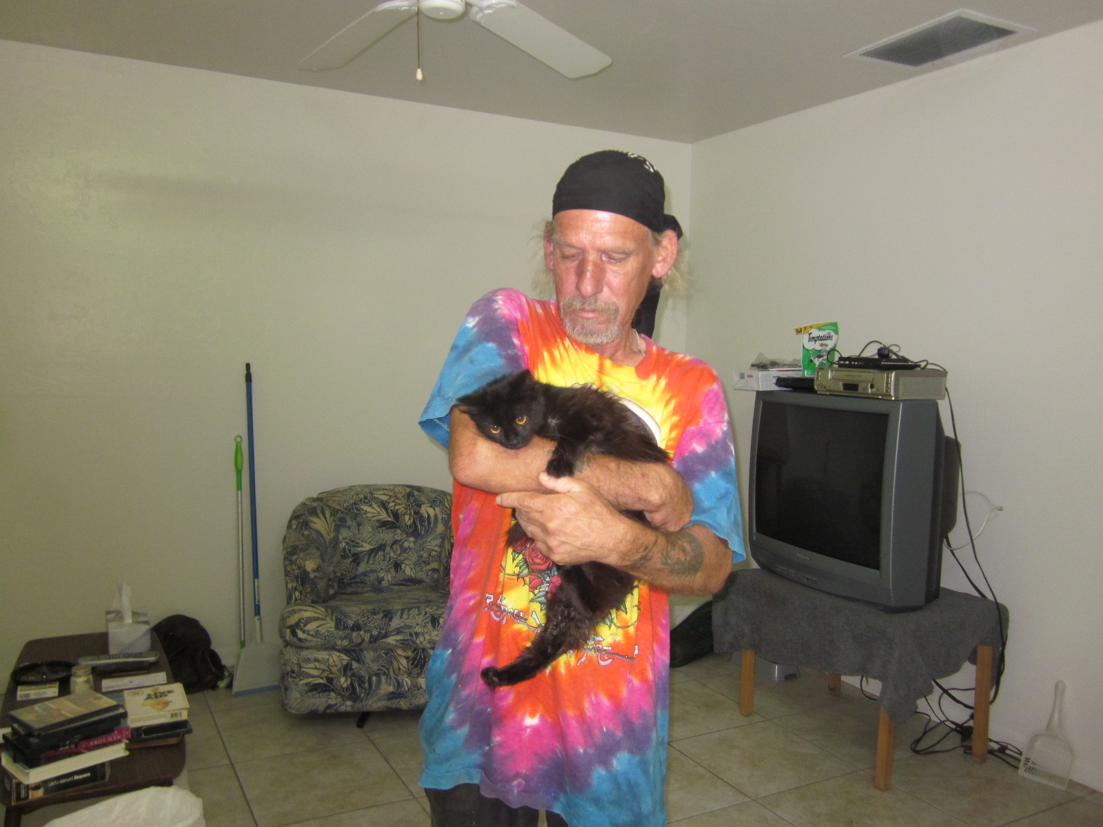 Kris has been homeless for many years. When he could he worked temporary odd jobs and sustained a room in someone’s house. He was a good painter and helped paint the ministry house in 2008. At that time he was caring for a beloved senior dog and spent most of his pay on dog food and Vet costs. We would also assist him with this. He was bereaved when his dog died in 2011. After serious injuries he could no longer lift his arm to paint or to do most odd jobs. He lived on porches, or when possible, slept on someone’s floor. While sleeping on an open porch Kris met a small black kitten, one of the many feral cats surrounding this house. He shared his food with her and patiently and lovingly befriended her. He called her “Hootie” because she turned her head like an owl.