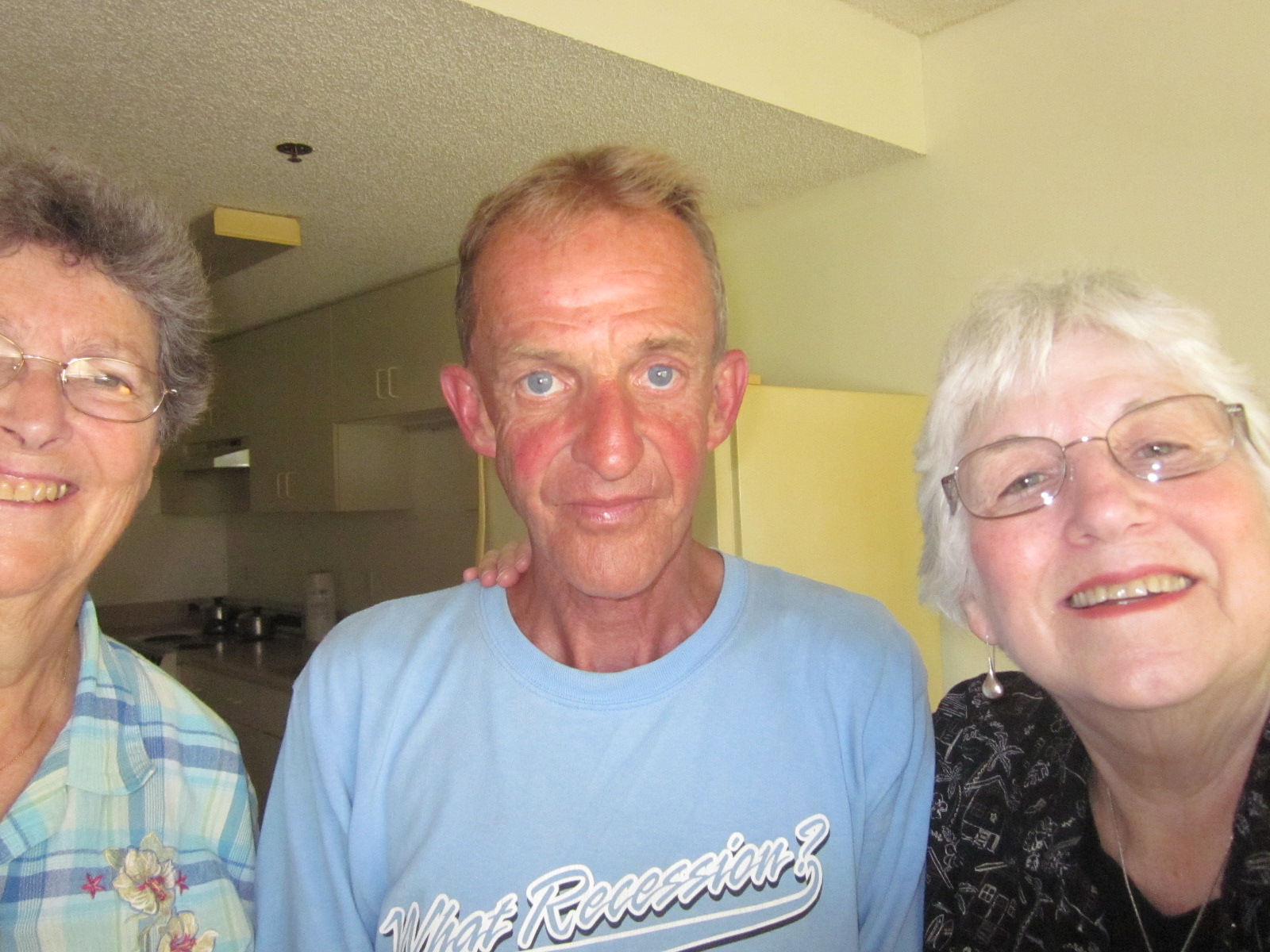 Tom says that he likes to be social and is glad that he is not alone anymore. We love his shirt-“What Recession”?