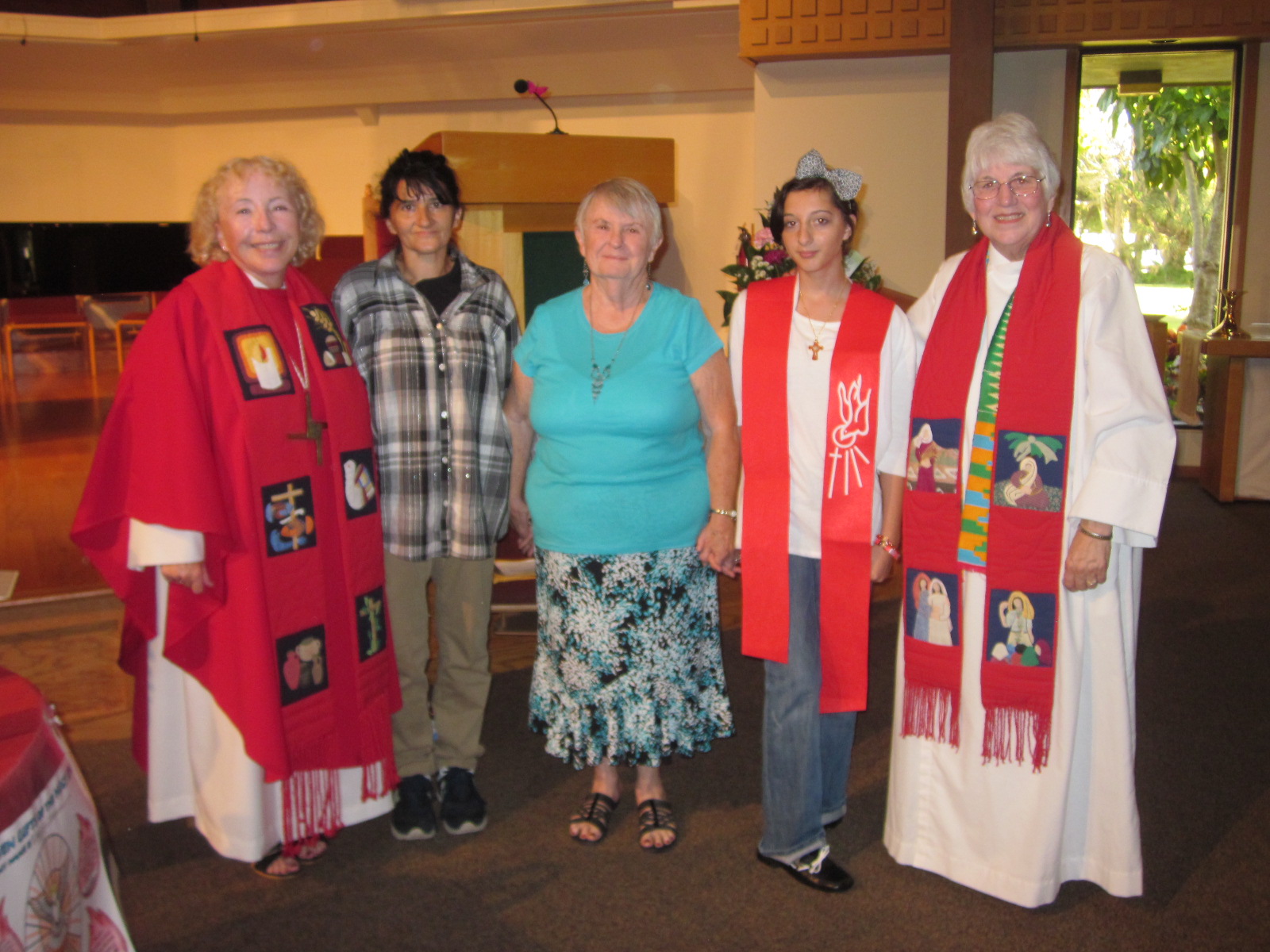 On Saturday April 26th sixteen members of The Good Shepherd Inclusive Catholic Community of Fort Myers, ,Florida were confirmed in the faith by Bishop Bridget Mary Meehan, Roman Catholic Woman Bishop in Sarasota, Florida. Pastors and Roman Catholic Women Priests Judith Beaumont and Judith Lee presented the group of eight young people, aged 12-18, and eight adults, aged 35-61 for the Rite of Confirmation. One man, Robert Swanson, 53, was also baptized before the Confirmation. He and five others also received First Holy Communion after years of faithful attendance and Catechesis at Good Shepherd. For Robert and for each one this Spirit filled celebration represents a turning around of his life and a choice to live in the Light and share Christ’s love with others in the community. Including the Sponsors,parents and Robert’s daughter and grandsons twenty-eight people from The Good Shepherd community and over thirty members and friends of Mary Mother Of Jesus Inclusive Catholic Community of Sarasota joined in joyful celebration. Almost all of the Confirmands and their families have experienced homelessness, poverty, unemployment ,healthcare and other difficult life struggles. Yet their determination to follow Christ and their love and joyful spirits lifted all present.