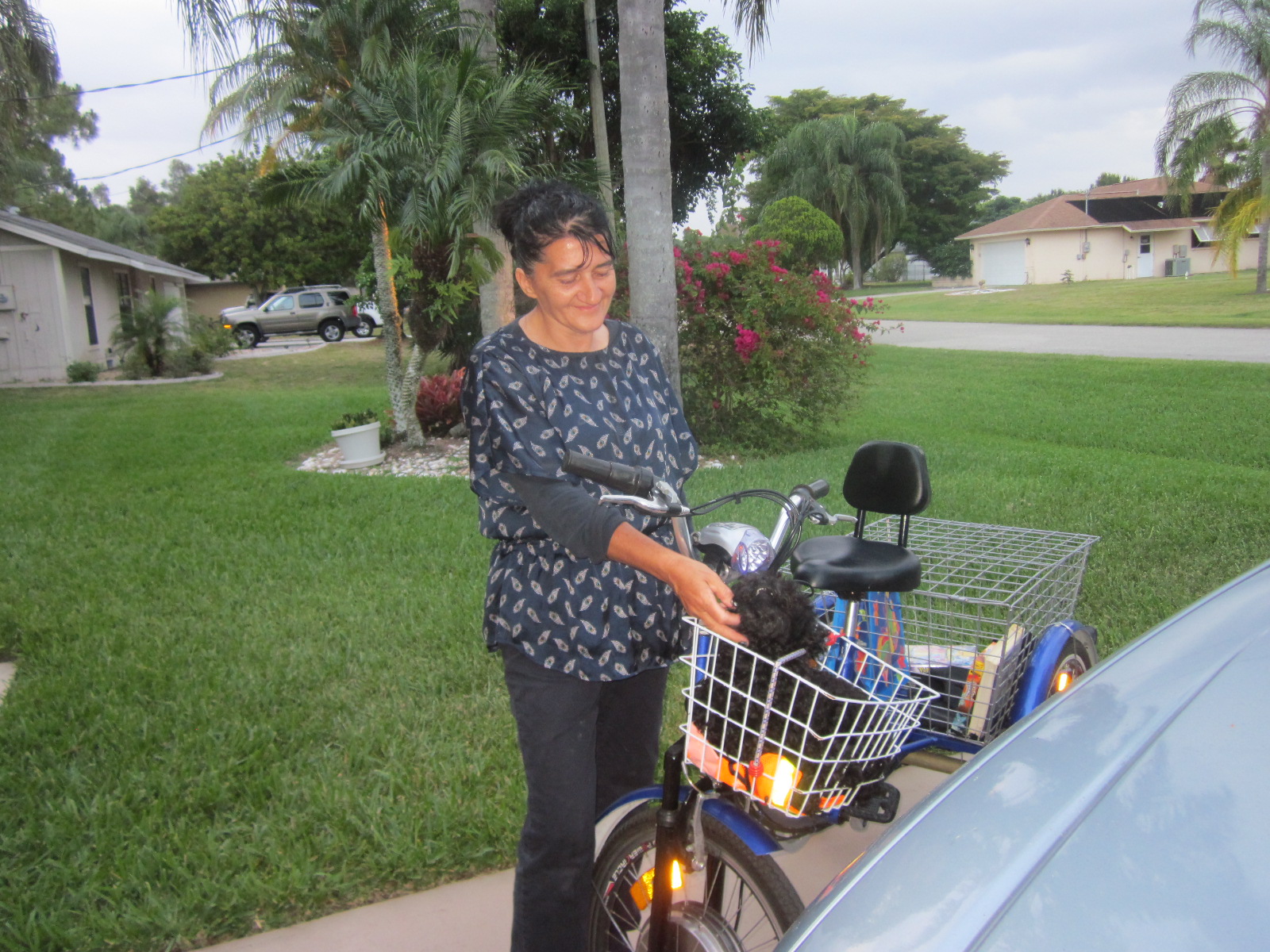 And later Lili brought her dog Spike and her new bike to visit us. She was in an accident with a car. She was not hurt but her other bike was beyond repair. She depends on her bike to get to work. She was distraught, but her son Gaspare, now completely recovered from his surgery, helped her to get a gently used bike. His recovery and his assistance made for a very happy Mother’s Day for her.She also had her rear basket filled with her Thrift Store Treasures, videos for our Good Shepherd children.