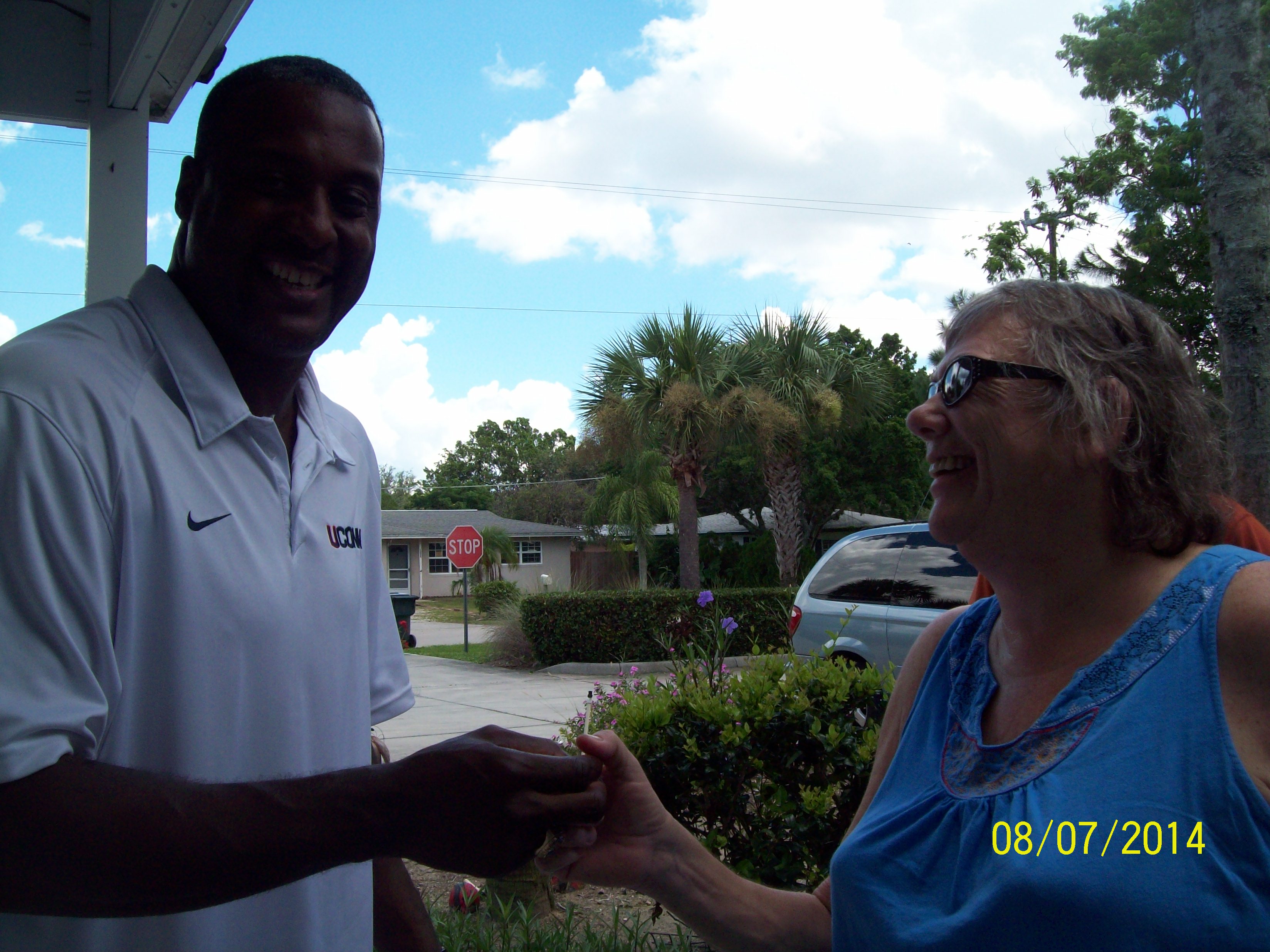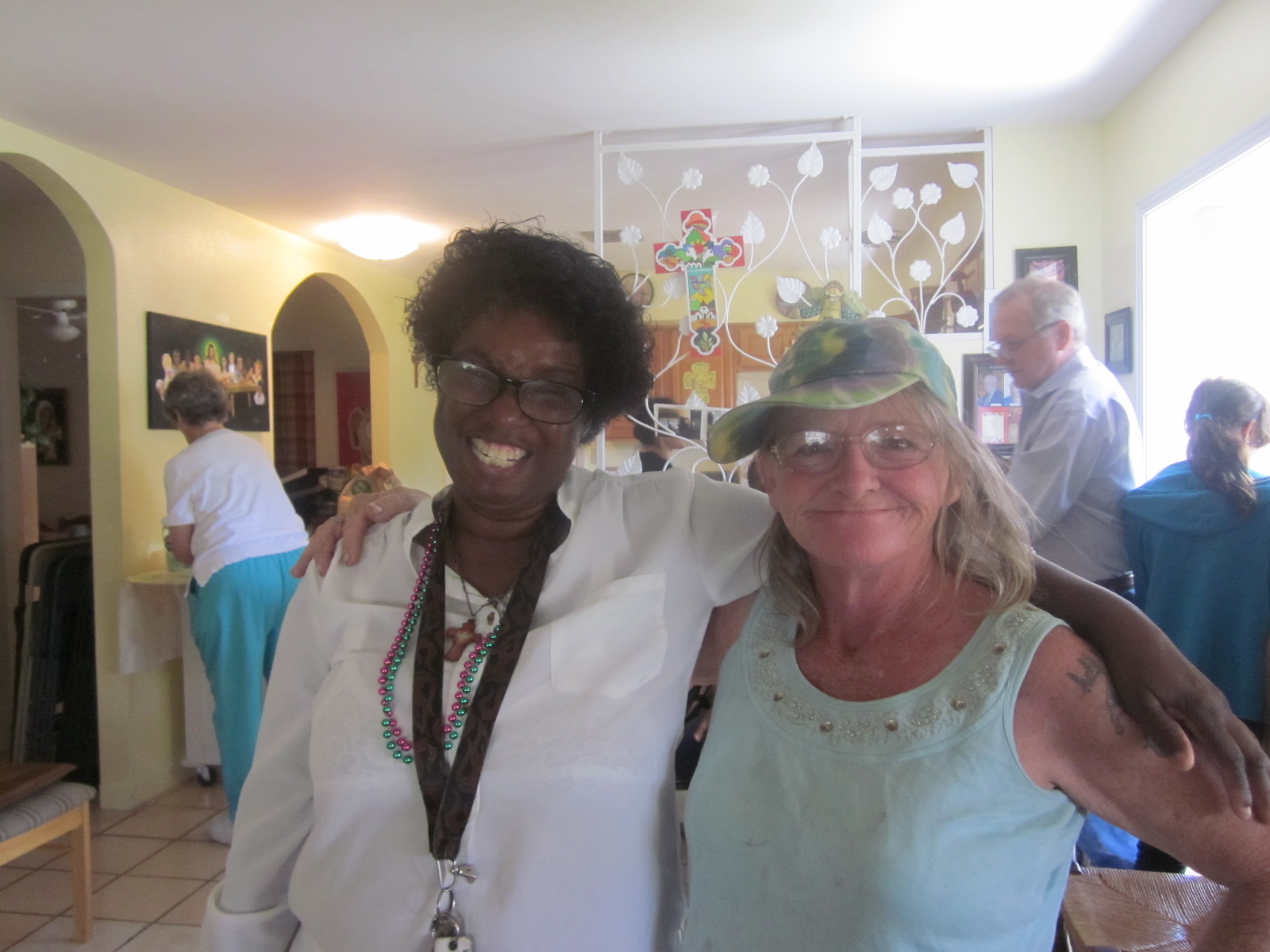On the right is Lauretta who had been chronically homeless over many years,disruptive and not welcome in any church or service agency in Fort Myers until she responded to the love and acceptance of our Good Shepherd ministry. Her story under her “pen name” Marietta for she wrote a part of the story herself is in my book Come By Here: Church with the Poor, 2010,Publish America now America Star Books.com. But the best part of the story is that it continues to be a story of a woman who is housed since 2009, happy and reaching out to family and others who are homeless to offer hope and help. Today we had our Tuesday Ministry and Lauretta shared with us how she is helping a relative who has cancer and is homeless with a child. She knew that we would help her to help this woman. One of the women,Diane, whom we housed this summer was brought to us by Lauretta who found her in the same park where we offered meals on Friday nights in 2007-2009 and where we met Lauretta. We also celebrated her birthday today, along with Betty’s and Louie’s both of whom we housed this summer. What a joyful celebration we had! But at the same time we had two men with us who were still homeless and whom we promised to continue to help toward housing. Yet they are hopeful because they know that if Lauretta and Louie who were chronically homeless can be housed, they can too. For us, it is not fast enough and the road is hard for all who live outside, but when we walk it together as a church community, with Jesus who brought good news to the poor and asked us to follow, it is easier.