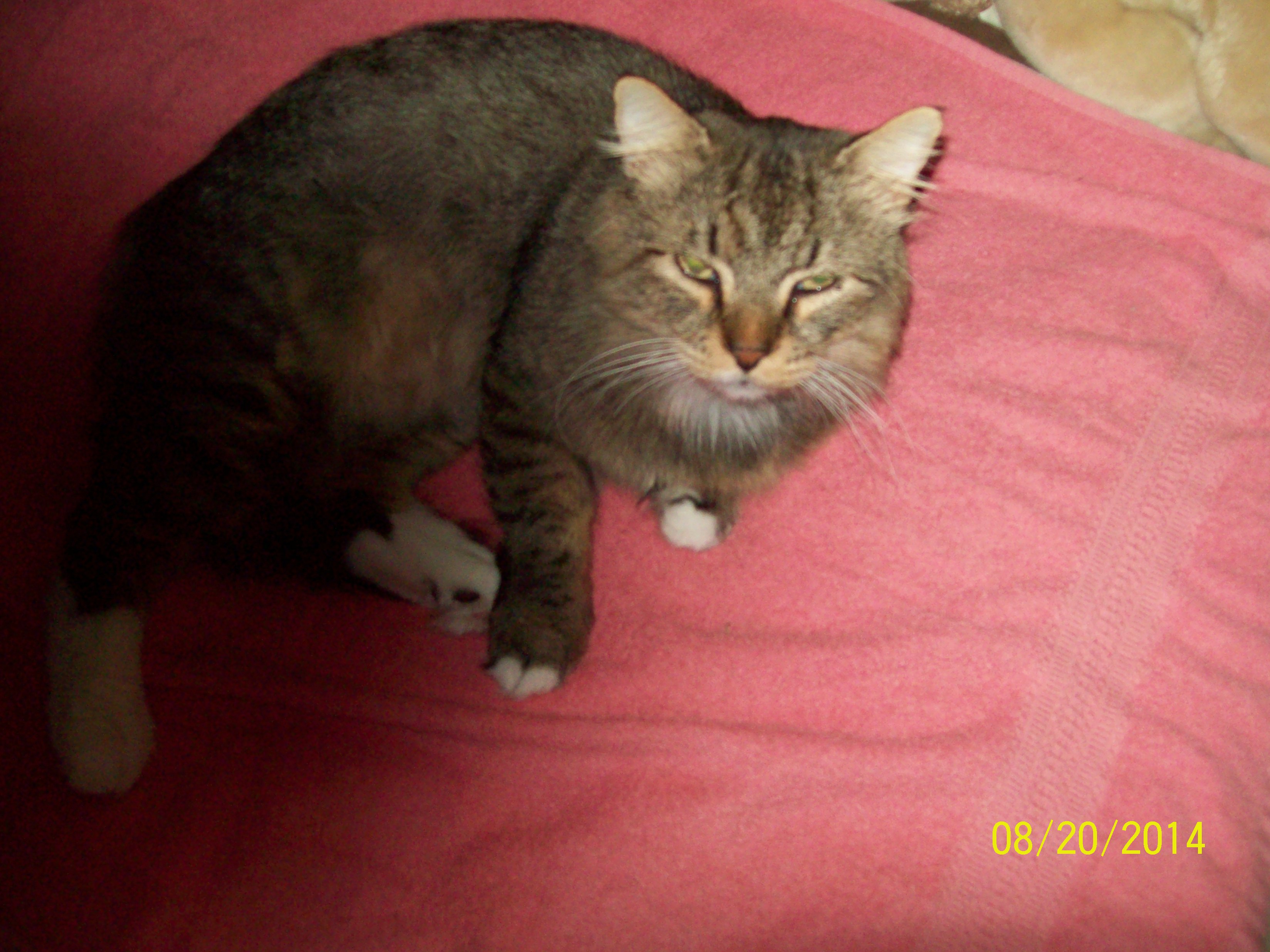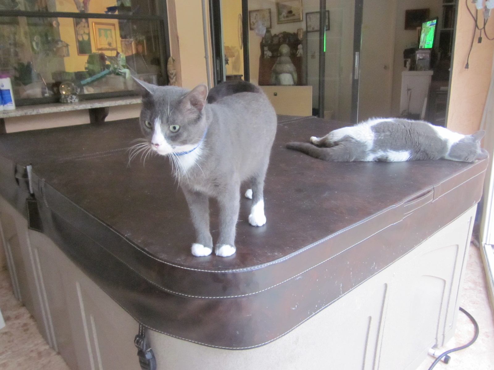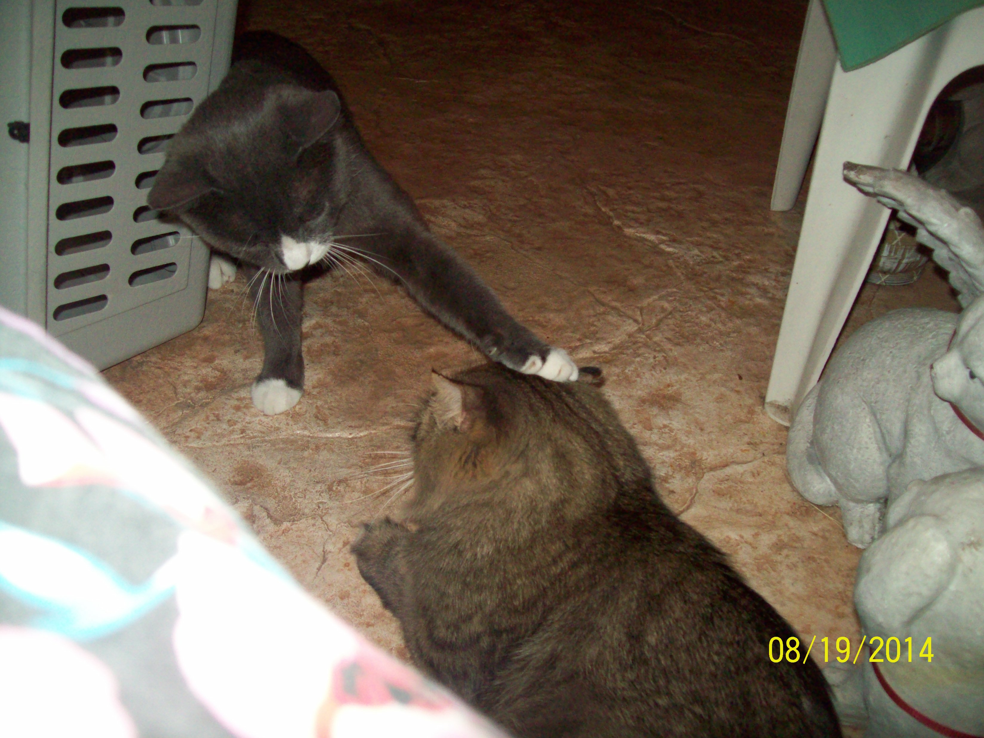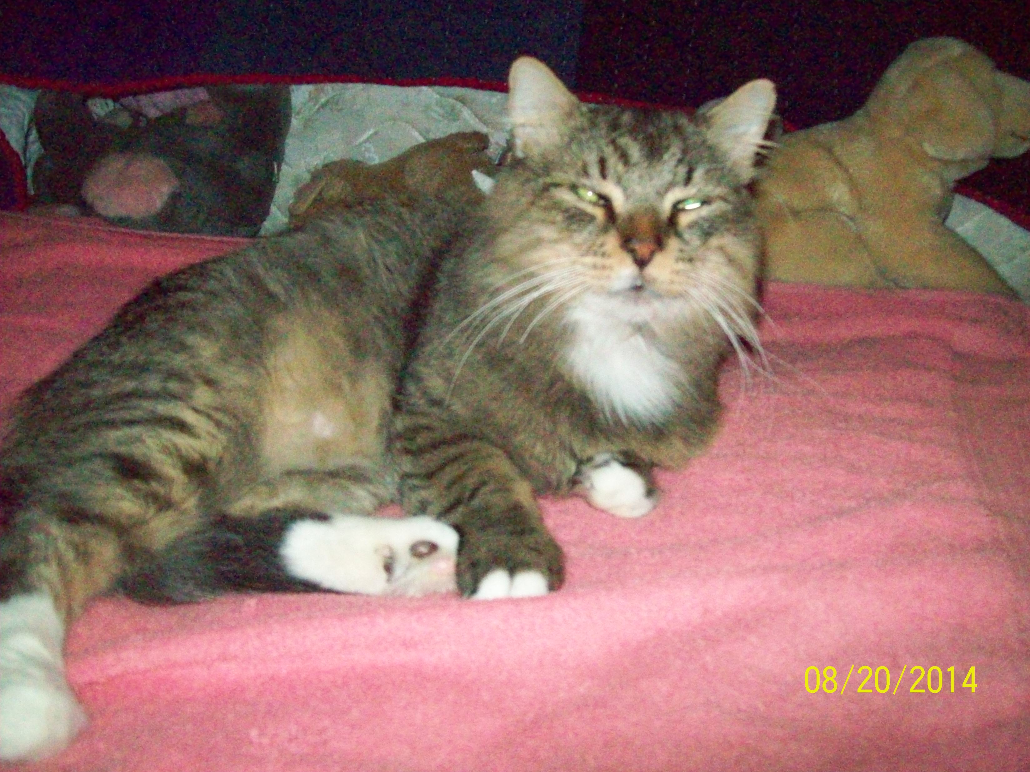These are two of our most recent “rescues”-Potsy(Peter Potter) and Velvet Velcro named because he has soft as velvet fur and sticks to us /Velly. Potsy was so scared when he came in that he had to be carried out of the bathroom where he stayed for a long while initially in a carrier to get some air and sunshine. Both are great cats who also have Feline AIDS but relate very well to our other kittys.