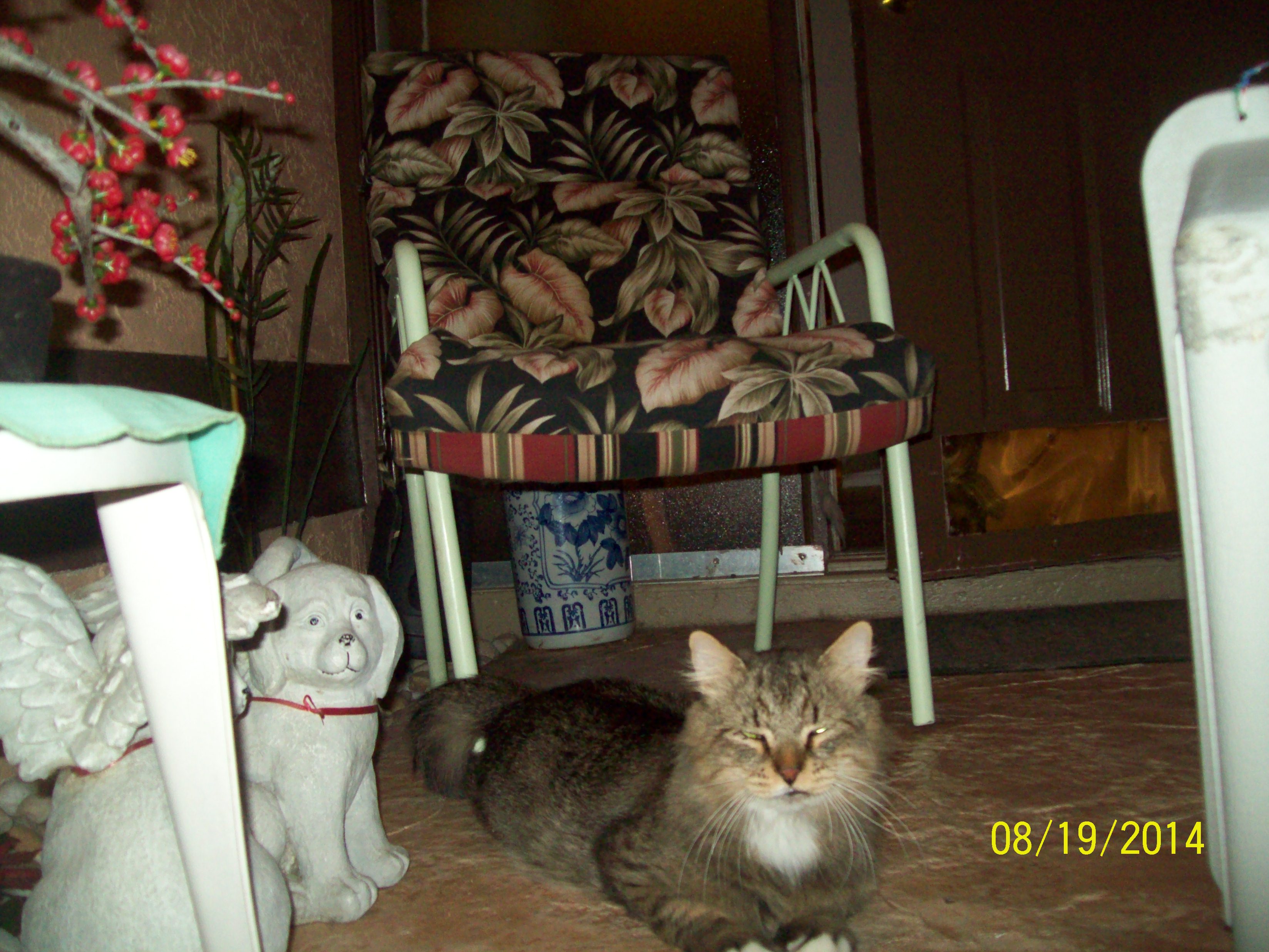 This is Socks, a beautiful and gentle Maine Coon cat who was the most frightened of all yet came every day twice a day to eat for over six months before I could get near him. He was the only one I had to catch in a humane trap. The others could eventually be picked up and put into a carrier for their first visit to Dr. Terry. Once inside he hid under a shelf in a back garage room for almost four months. Every day three times a day I would visit and talk to the shelf. Eventually he sat on top of a wardrobe and let me touch him just once. He responded to my kneeling on the floor near his shelf and reaching out. That picture is below. Then one day, he walked out of that room, came up to me ,rubbed my legs and has never left my side since. He is the most affectionate cat we have now. It took a long while to build that trust and a lot of patience, But it paid off. Indeed, that was the same method used when reaching out to very frightened mentally ill homeless people when we do our street ministry. In my book The Flamekeeper and other Poems America Star Books) I wrote a poem about standing on the outside looking in, and how similar it is with people and animals who have been hurt and frightened. Ultimately, it is easier with animals for when they trust, they seem to let go of the past and live in the warmth of a better now.