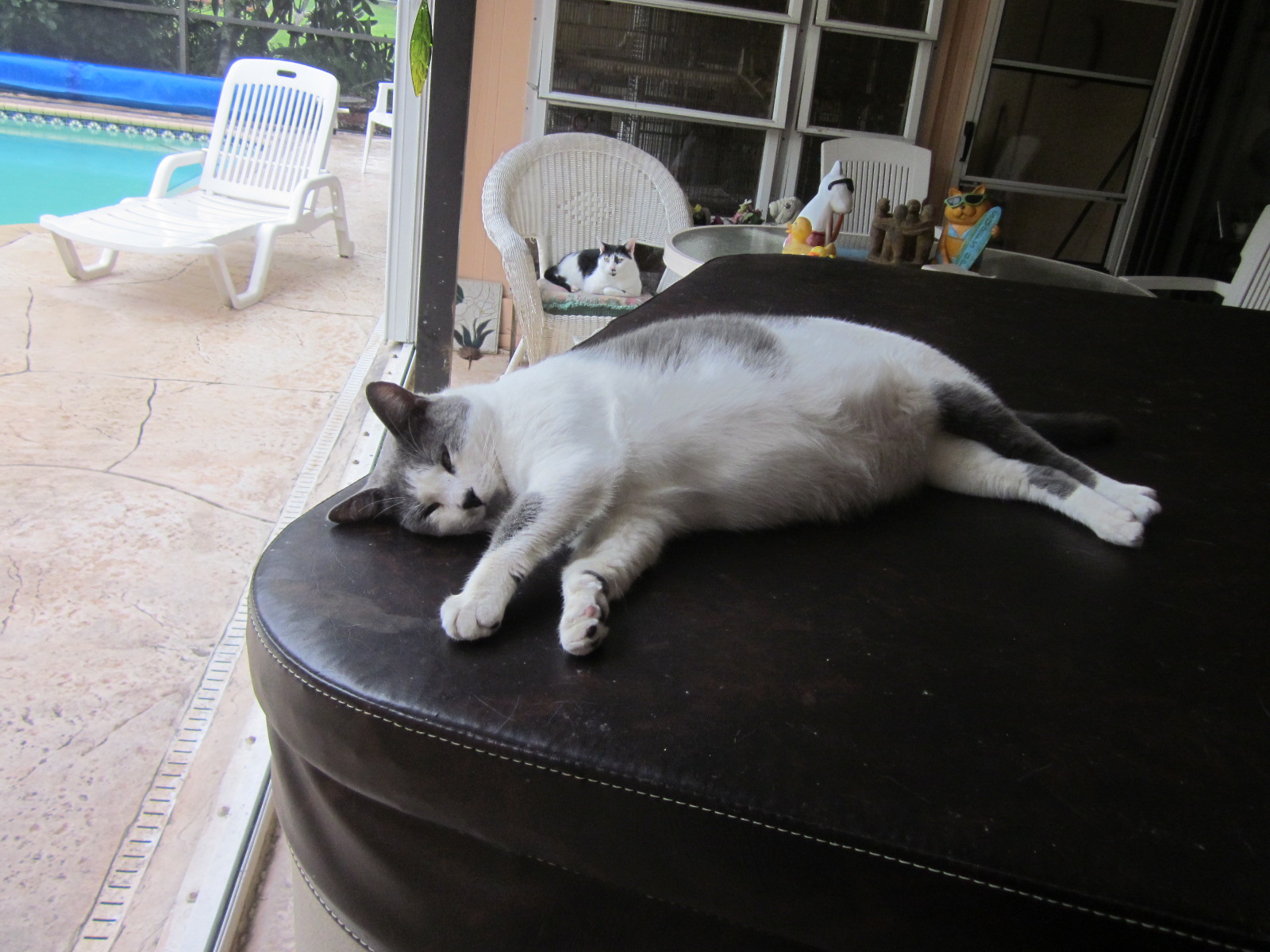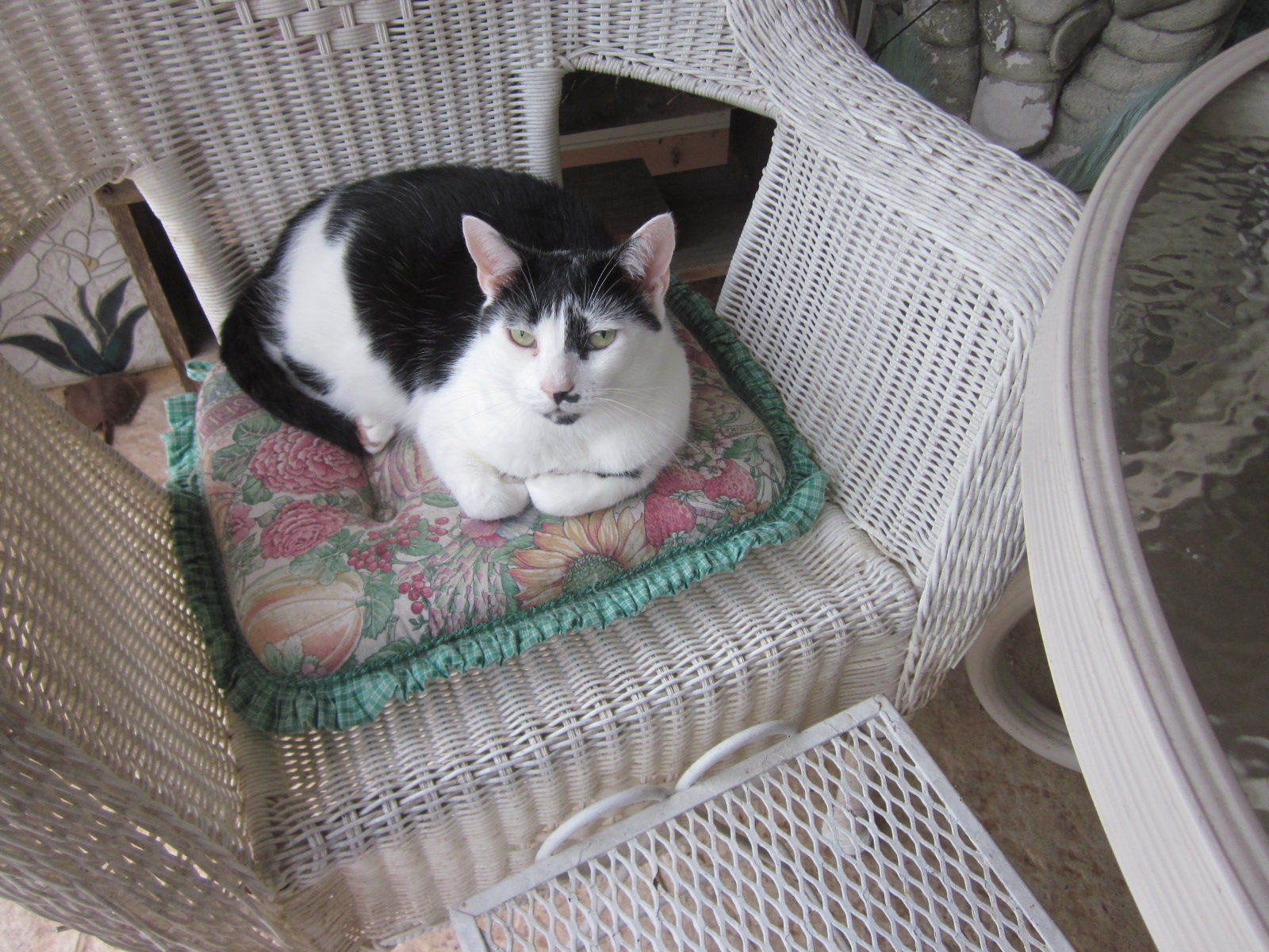 Below are the group on the front lanai, Velcro, and Star who is a perfect loving little cat who joined us in 2009, even charming Angel, our big dog who did not like cats! Socks and Velly, who are now close friends and Henry, one of our older kittys who came to us in 2003 with his brother Timid Tim who did not show up for a photo. Then there is, Lady Guinevere and her kittens(now 5 years old) who were given to me by a homeless couple who lived in the woods and could not care for them. When I entered the woods to get them, Lady Guinevere purred and walked into the carrier with five kittens following her. It was the easiest rescue ever! They had been loved in the woods but Lady G knew a better home was waiting. It turned out that Lady G had Feline AIDS as did three of her kittens. The other two little beauties were soon placed in homes, but Lady and these three,Winter, Elana and Sir Gallahad, along with Brother Maurus,their brother who came to us two years before are still with us. They remain together as a family on one side of our house. The pretty black and white, Sammy sitting in the grass is the next to be rescued and I am hoping that I have a home for him. We are hoping for a home for him and for two more of the brothers who come to eat morning and night. Sammy may be able to find a loving home with Diane, who was homeless and is enjoying her new home and wanting a kitty. Sammy is Velly’s brother and Velly greets him through the screen each day. He seems to be saying-trust, brother, it is good to be inside and have a home!