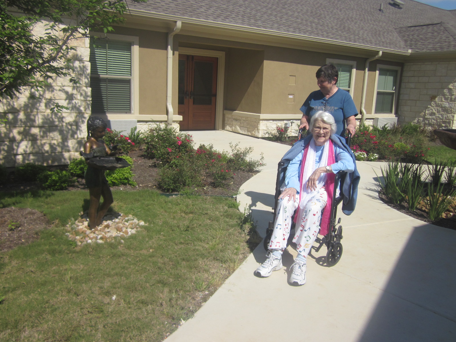 In the last two weeks we have visited two beloved people now living in Hospice. When we went to see our sister Priest, Adele, she was in a Hospice bed in a Rehab and Nursing Facility. It was new and beautiful and the mixture of people trying to get better and those letting go was a good one. We enjoyed smiles and greetings with many residents. Our Adele, who has chosen joy throughout her life, was coming through a dark night of the soul as it faces the ending of life as we know it . She felt more than ready to meet her loving God. Yet, rather than lay down and wait and hasten death she had taken hold of life again and was sharing her ministry with all who came into contact with her. She is looking forward to her eighty-eighth birthday next week and the visit of her son. Her light is steady and clear and no one can set aside or shelve this elder who is in Hospice care. She was able to go outside with us for the first time in several months.