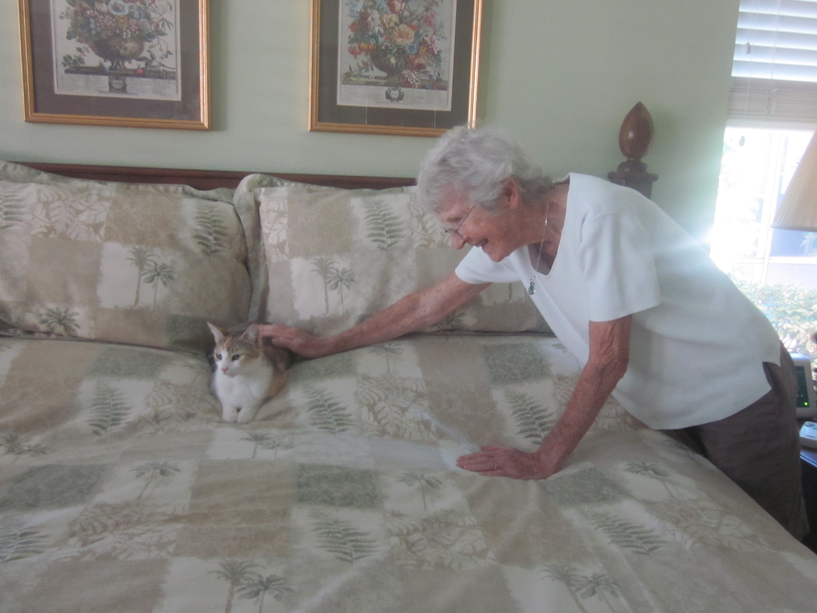 Pat and Joe who are wonderful supporters of our ministry ,like Ginger, lost their cat of twenty years. It took some months but they were ready for Missy when I called. Here they are welcoming her into the most wonderful bed she has ever known.