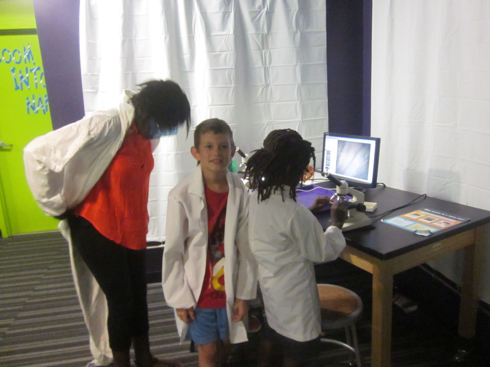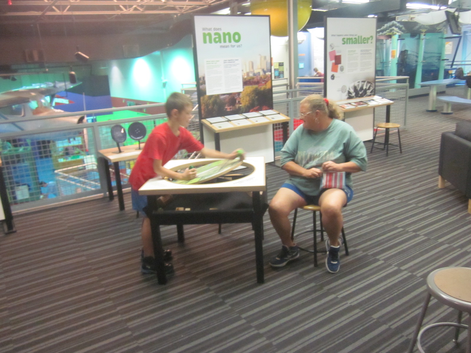 Owen lost his father to cancer seven months ago. He also moved twice in that period of time. He was truly depressed and negative adding to his mother’s grief. But Owen and his Mom met Brenda who has been a member of Good Shepherd since our feeding ministry in the local Park in 2007,although she moved out of this County for a few years and returned on Palm Sunday . Brenda befriended them and literally shepherds them.  Owen has joined our Sunday school and summer youth program.  His Mom has begun to talk with me about her  grief and difficulties. The change in Owen is obvious to all. It reminds me of what Jesus said about children in several places including Luke 18:16-17. He welcomed the children and admonished the disciples saying that unless we receive the kingdom (kin-dom) of God like a little child we will never enter it. Wow! So let’s look at how our children accept what God is offering-and it is with great enthusiasm and joy. The more love and caring and good experiences in God’s creation they receive, the more joyful they are. IMG_0049 This is Brenda with Owen at our trip to The Imaginarium,where all of the children (and the adults too) become scientists for a day. IMG_0042