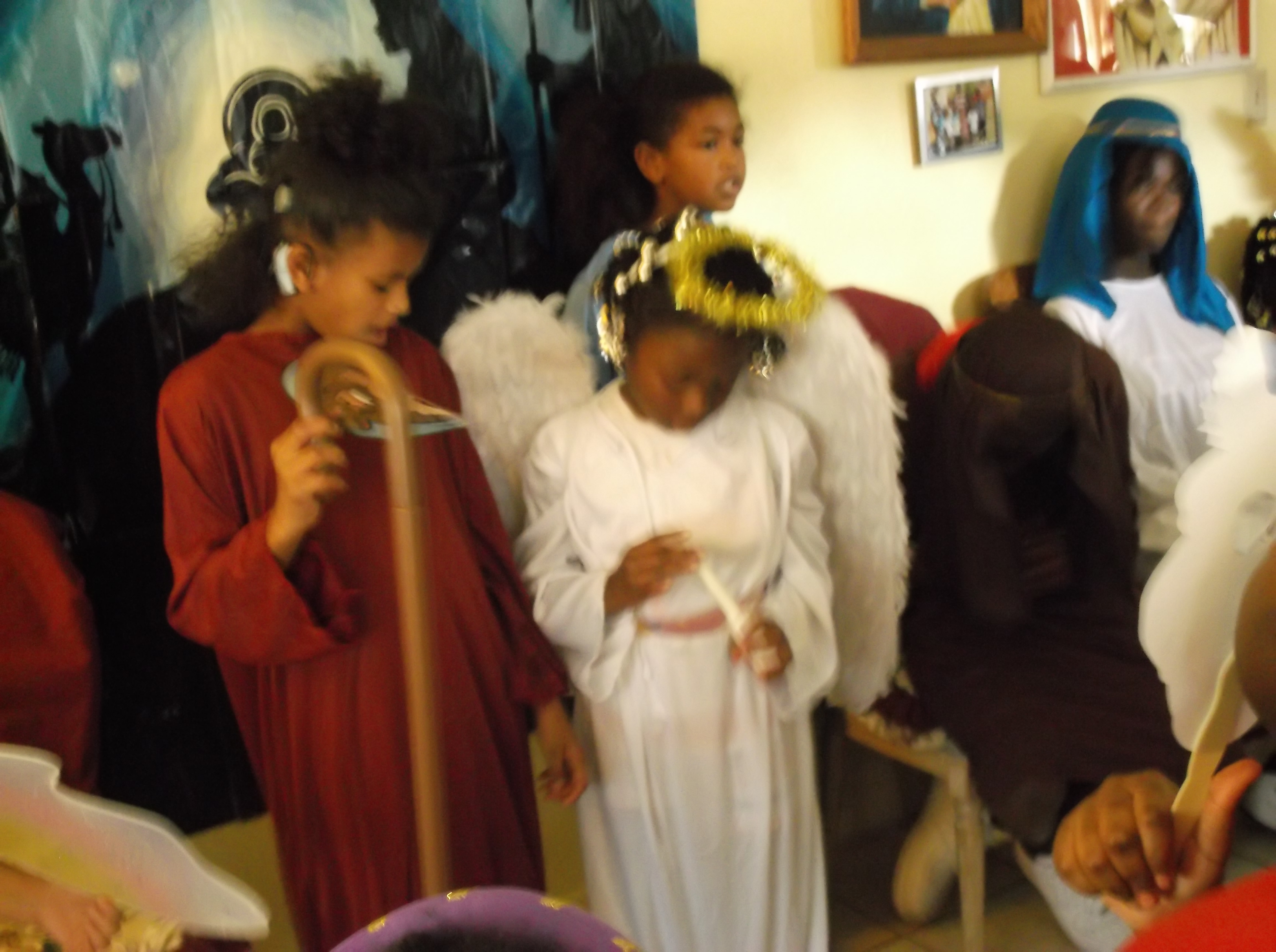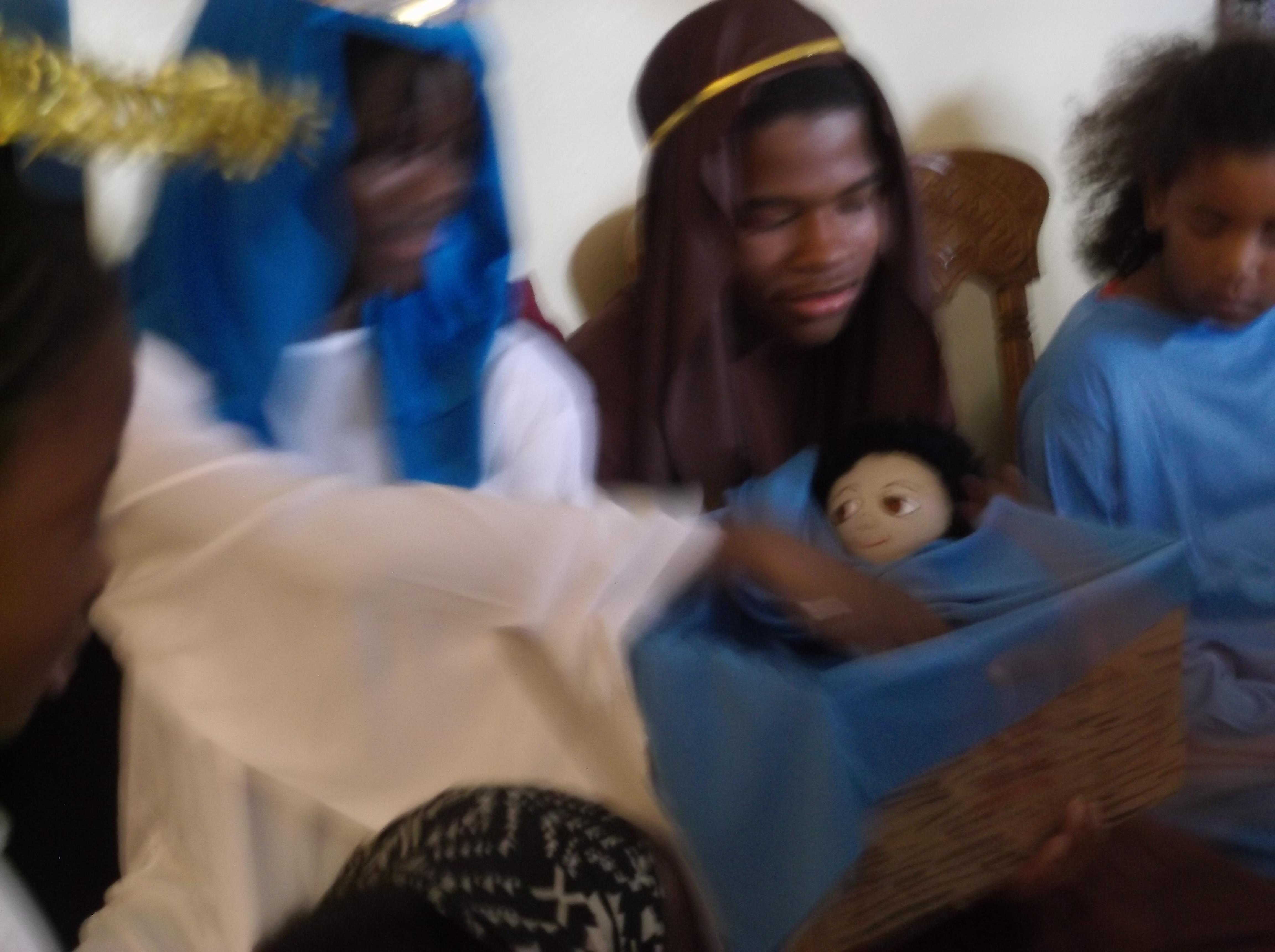 Mary is Elizabeth Hasan, 13 and Joseph is Keion Lewis also 13. Arnya and Arliyah Jackson and Kiya Battles are shepherds and Niya Battles and Gina Landini are angels. Jon’Est Smith,Jirliyah Jones and RiyaBattles are the Wise Persons. Their teacher Pearl Cudjoe and Cyrillia Rismay are teaching them the song “Oh what a pretty little baby, and Jesus is his name. ”