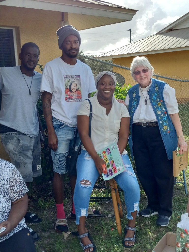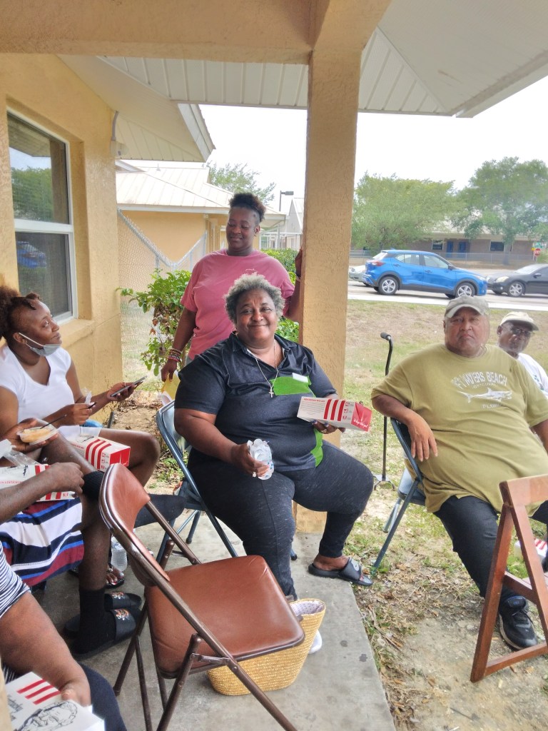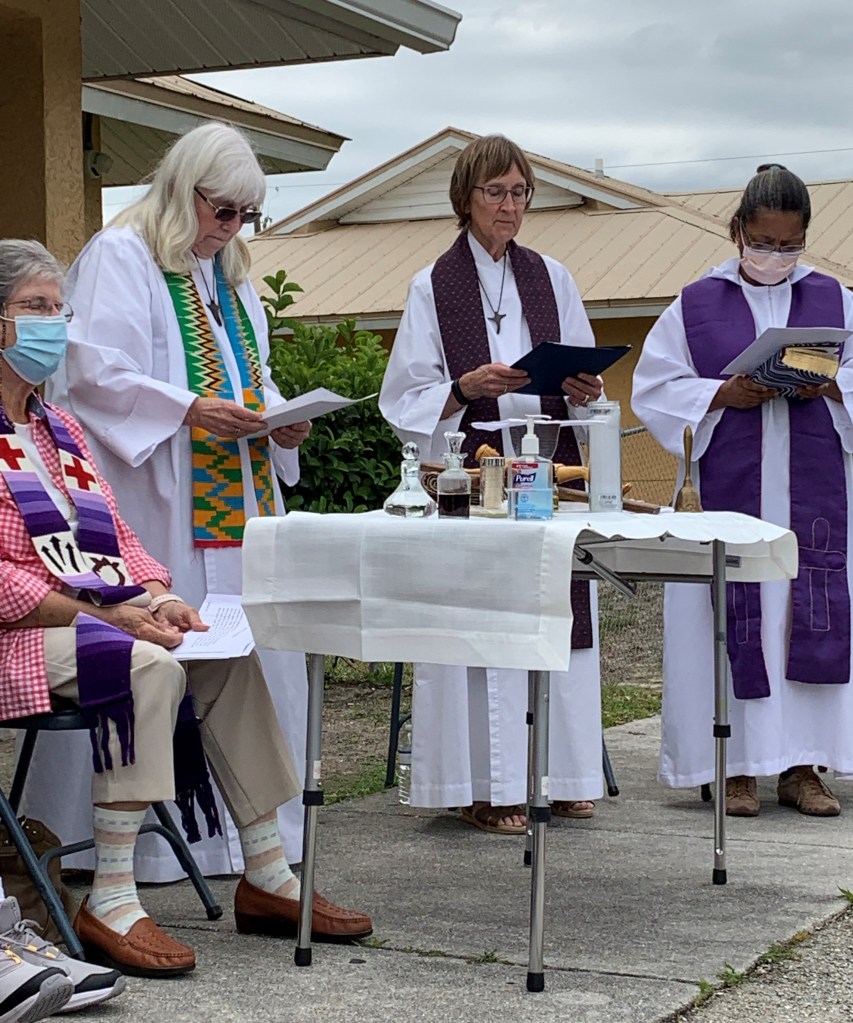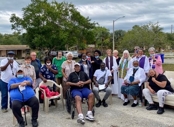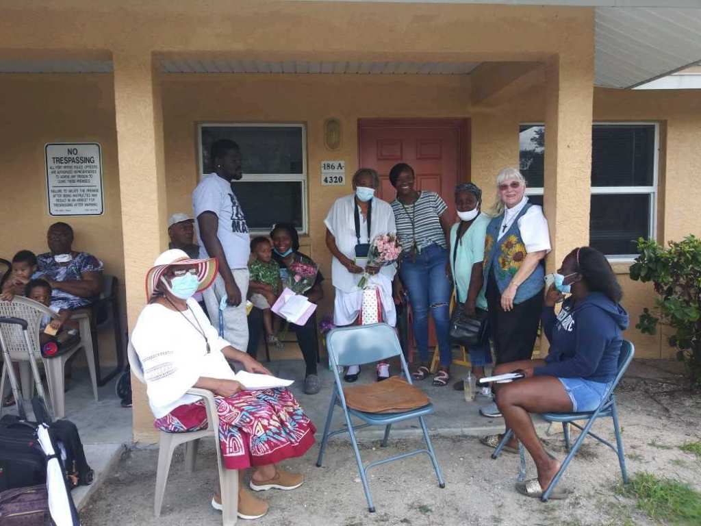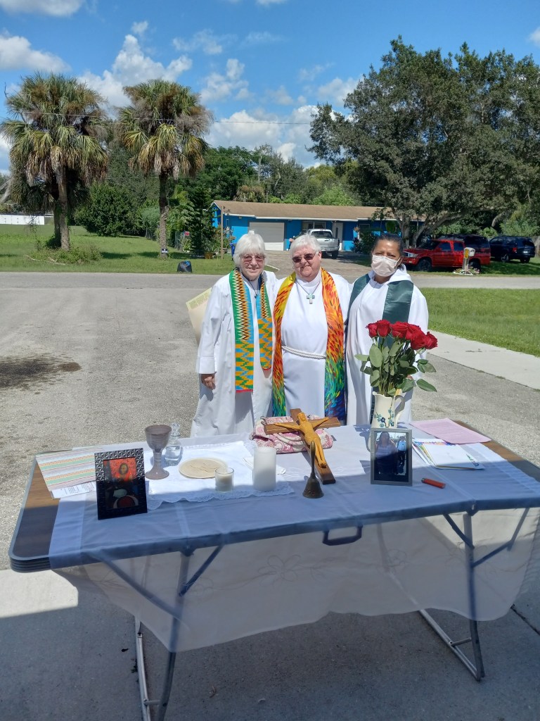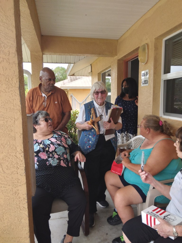 In the picture above, Pastor Judy Lee carries our Cross for the Altar table outside the homes of six members who live in the Goodwill Community for the physically disabled in East Fort Myers where we have met several times during the Covid 19 pandemic. Our Church Elder, Mr. Harry Lee Peter Gary (top left) opens his home for our setting up and our faithful member Pearl Cudjoe (top right) makes sure we have a meal for each one attending for our Fellowship Time after Church. Donna Girasi and Kathy Roddy and Stella Odie Ali (not pictured here) also brought wonderful food and desert for our meal time. Also in the picture are Donna Girasi (seated left) who read the Hebrew Scripture and Brenda Cummings (seated right) who read our New Testament Scripture. Next to her is our beloved Ellen McNally who always brings a table full of donated items for perusal after the service. Ellen, who is in her nineties has been doing this since we began our ministry of worship and a meal as Church in the Park in 2007. Mr. Gary and Brenda and Pearl have been with us faithfully since that time as well. Next to Ellen were Kathy Overby and Kathy Lauwagie, our snowbirds from Minnesota. We were so pleased to have them with us. This was a very hot day and all understood as we let them know that in the coming hot and rainy season we would no longer be able to meet outside. As one member said, God will provide a suitable worship space for another time.
