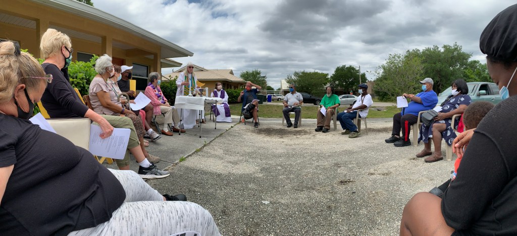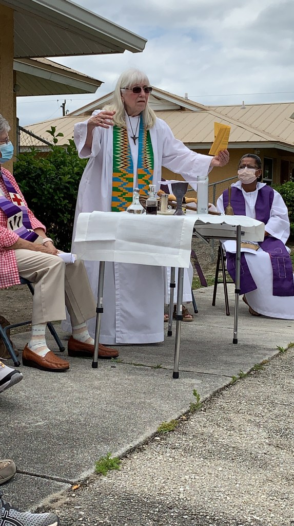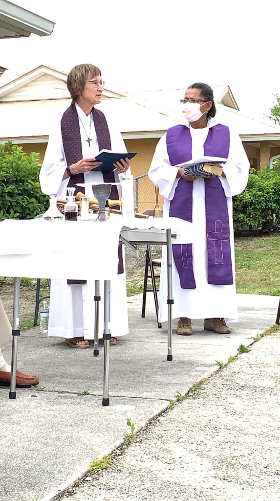 These words from an old hymn describe best the feelings of all of the members and Pastors of our Good Shepherd Inclusive Catholic Community in Fort Myers Florida, as we met for the first time since Covid 19 invaded over a year ago! Three Roman Catholic Woman Priest Pastors presided assisted by Pastor Sarah Faulkner from The Abundant Grace Fellowship that also serves the homeless population here. I, with great thanks, am Senior Pastor and my Associates are Rvda. Marina Teresa Sanchez Mejia, RCWP originally or Colombia, SA and Rev. Judith McKloskey, RCWP of Kansas City Missouri who is with us seasonally. Thanks be to God for those who serve and for this congregation many of whom have been together since 2007.