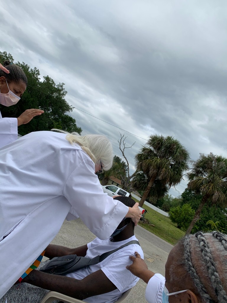 It took a lot of cooperation and love to put all the parts of our afternoon together. The three Priests planned and served the Mass and Pastor Sarah read the Hebrew Scripture and picked up and brought Brenda Cummings and Timothy Vanderwarf and our esteemed CTA President, Ellen McNally with her. Brenda brought a stack of drawings that she made as Easter gifts for all and we put them on the altar with the gifts. Roger picked up Mary Flowers. Natasha Terrell brought her Grandma Jolinda and sister and little nephew, necessitating several trips. Pastor Marina and Jose brought 8 plastic chairs and with Carol Schauf’s kind help we brought assorted goodies for dessert and eight folding chairs and the Altar table, sacred items and linen. Stella Odie-Ali brought the Birthday cake for Timothy and Jakeriya Maybin’s birthday celebration afterward and Dan Shaw, Pastor Judith’s husband, brought water and boxes of Kentucky Fried Chicken for each one for our meal afterward. Mr. Gary opened his home for hospitality and so we also had some inside space as needed. We put our chairs in a big circle and began our worship service with eager anticipation. I welcomed the congregation with the words used by Ecclesia Ministries in its out door services with the homeless and others : “Come unto me all who are weary and carrying heavy burdens and I will give you rest….” Several of our people are battling cancer and other serious illnesses and many have other worries in daily living on very limited incomes. These words of Jesus reach them immediately.